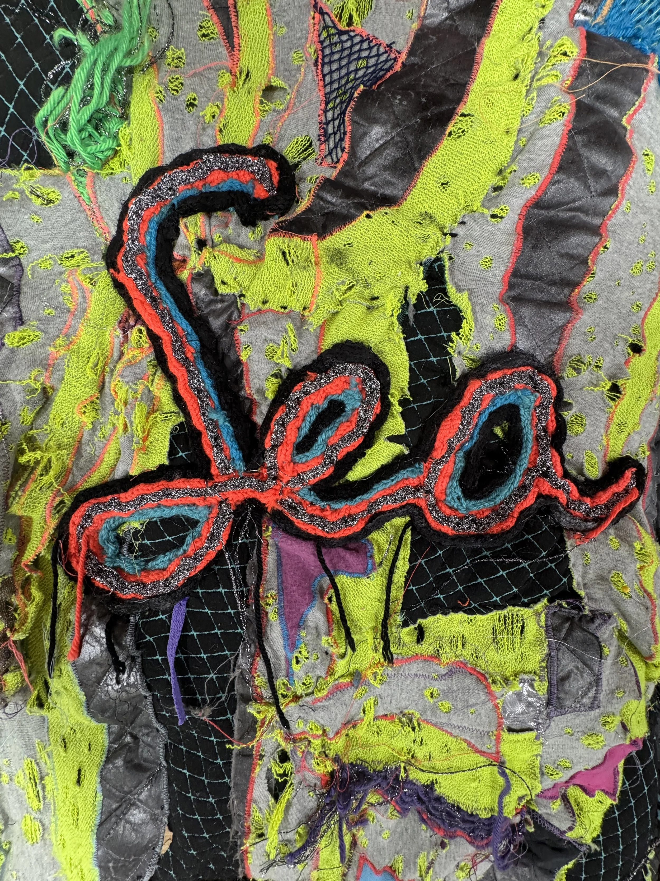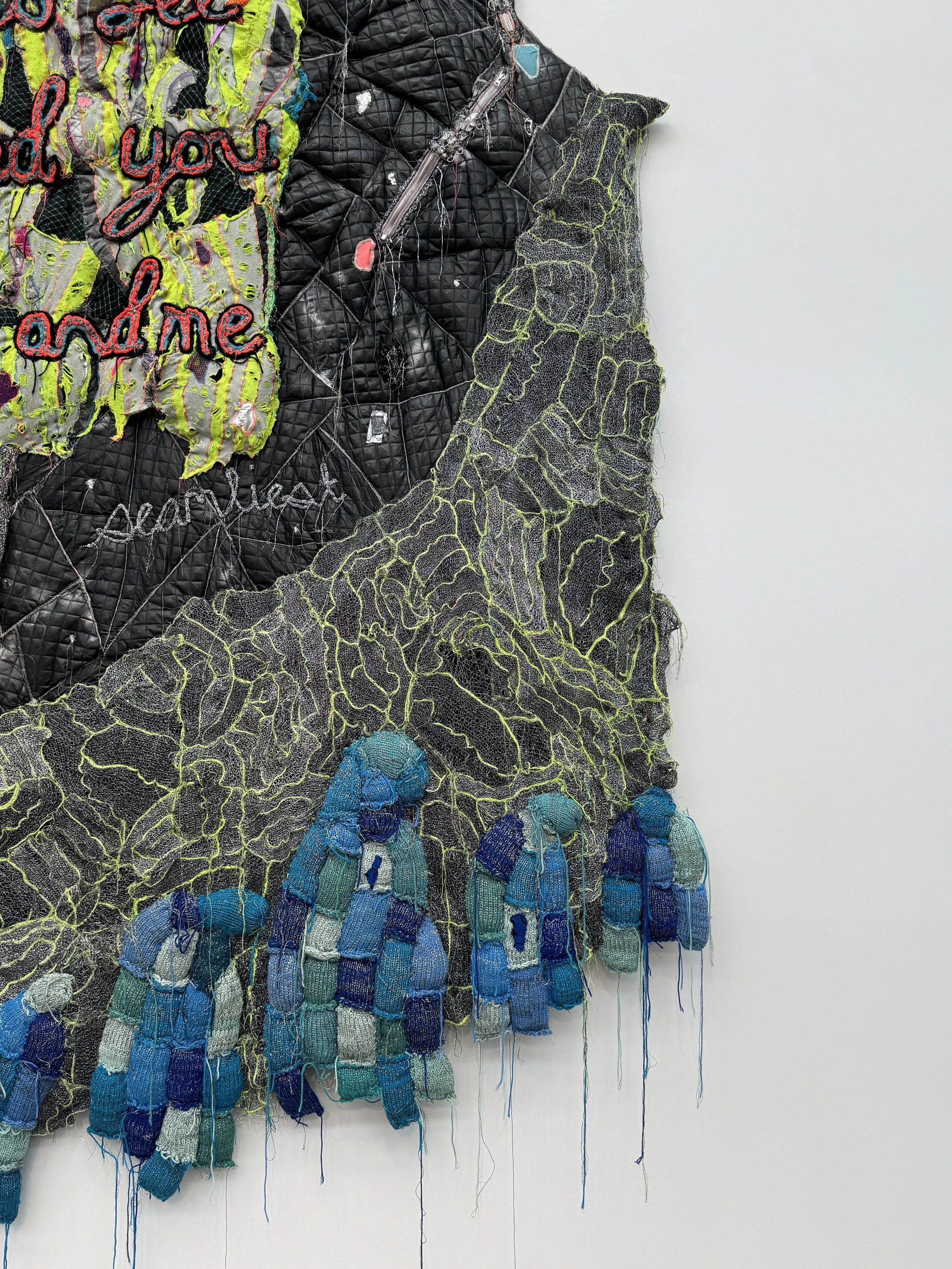 Assorted fabric, yarn, lurex, thread, zippers, shoelaces, metal D-ring fabric tape, acrylic paint, spray paint, poly-fil