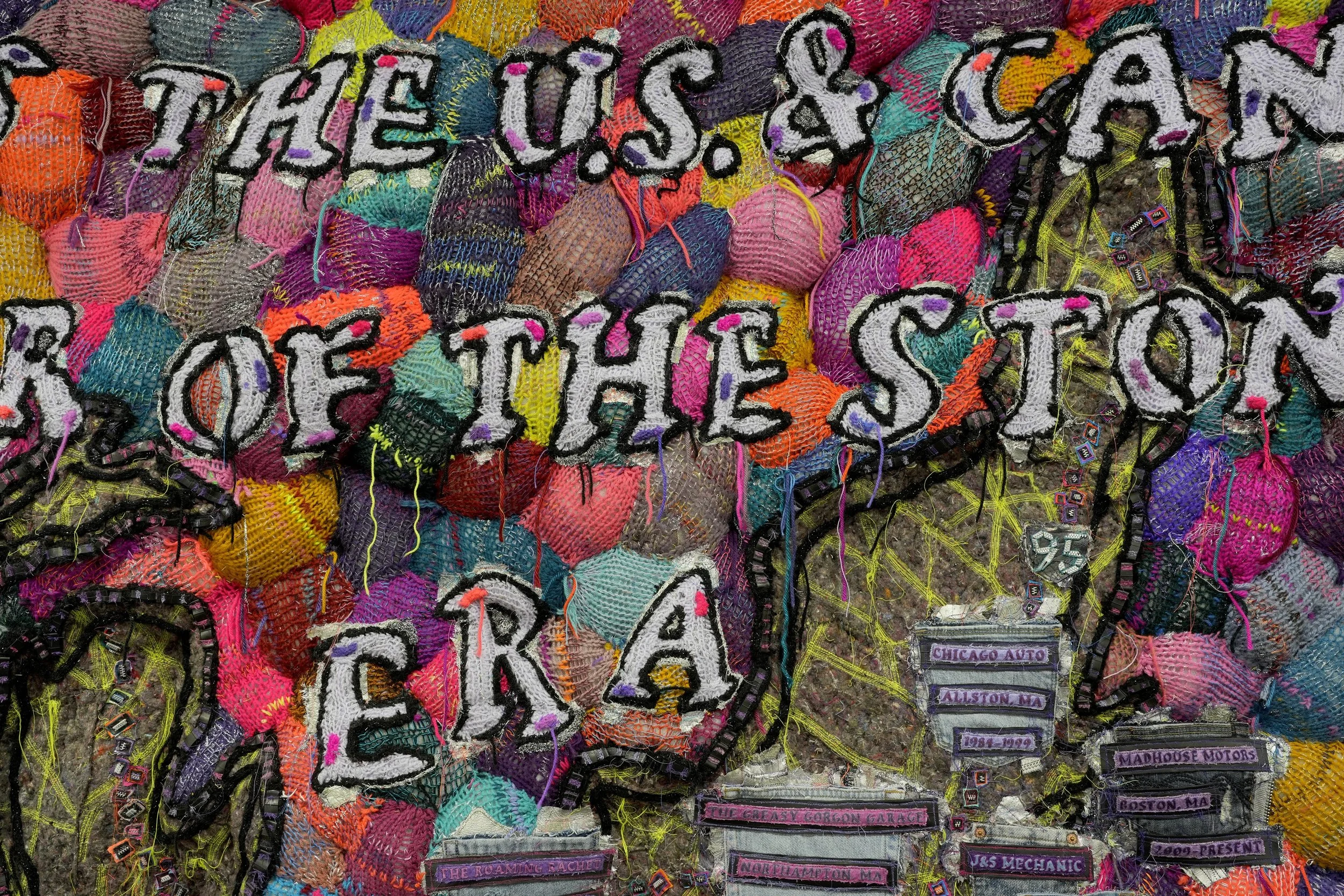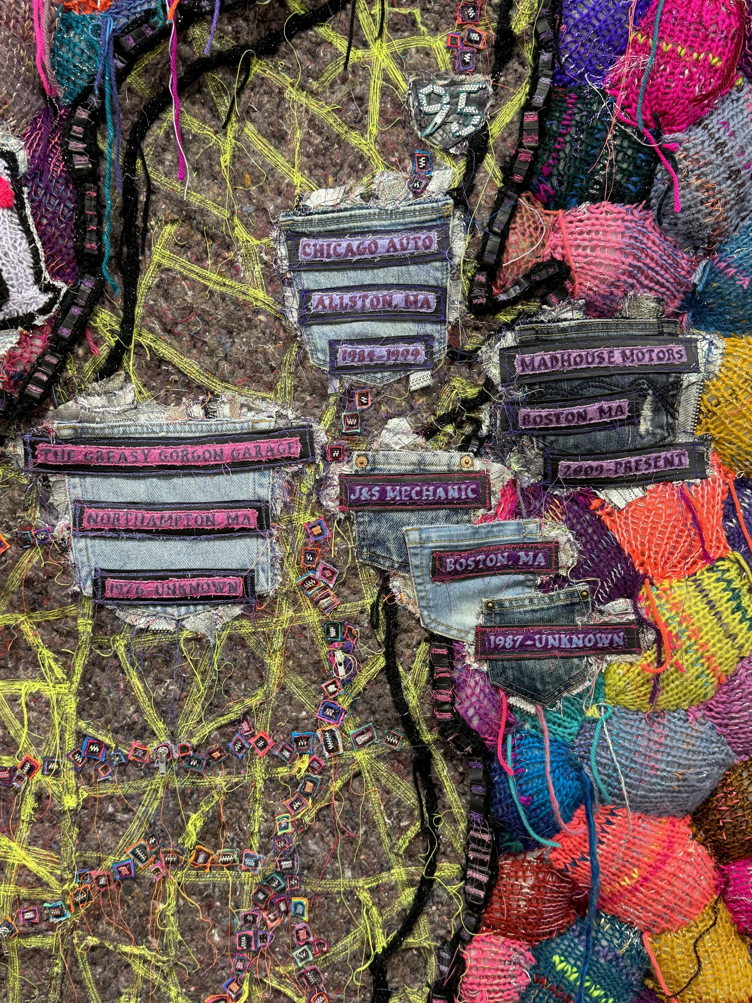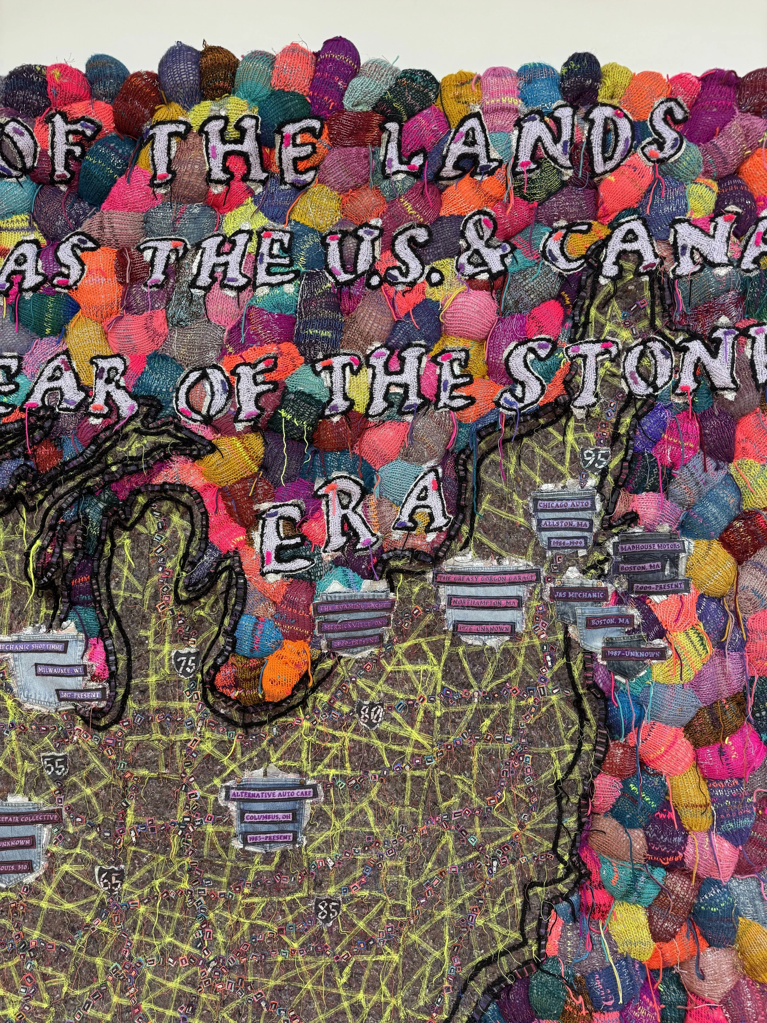 The centerpiece of The Queer Mechanix project is a large-scale quilted map of queer and trans auto mechanic shops across the United States and Canada that operated from 1969 to 2023. Roberts utilizes an expansive range of textile techniques, including toy knitting machines and hand-stitched embroidery, to create a monumental textile collage. The map ration of each of the shops in single-strand embroideries, sewn onto upcycled rubber tire innertubes and blue jean pockets. Zippers mounted on rubber and hand-sewn fabric demarcate the interstate road system that crisscrosses the United States. Assembláged road markers illustrate the roadway connections of these auto mechanic shops and evoke the presence of drivers who traverse the highways.