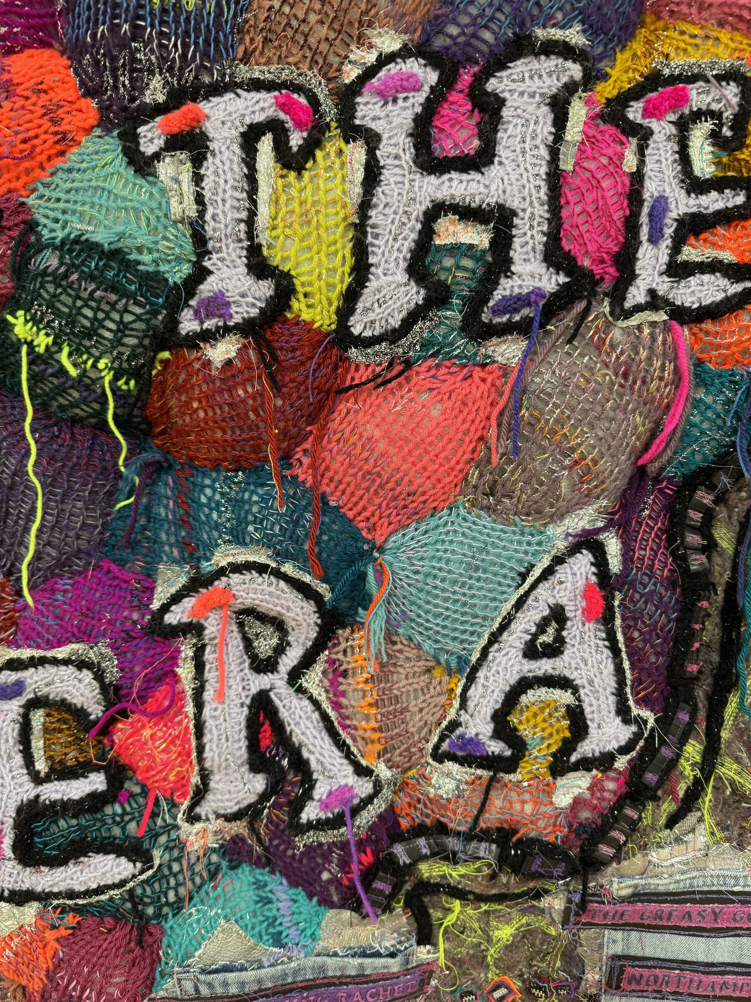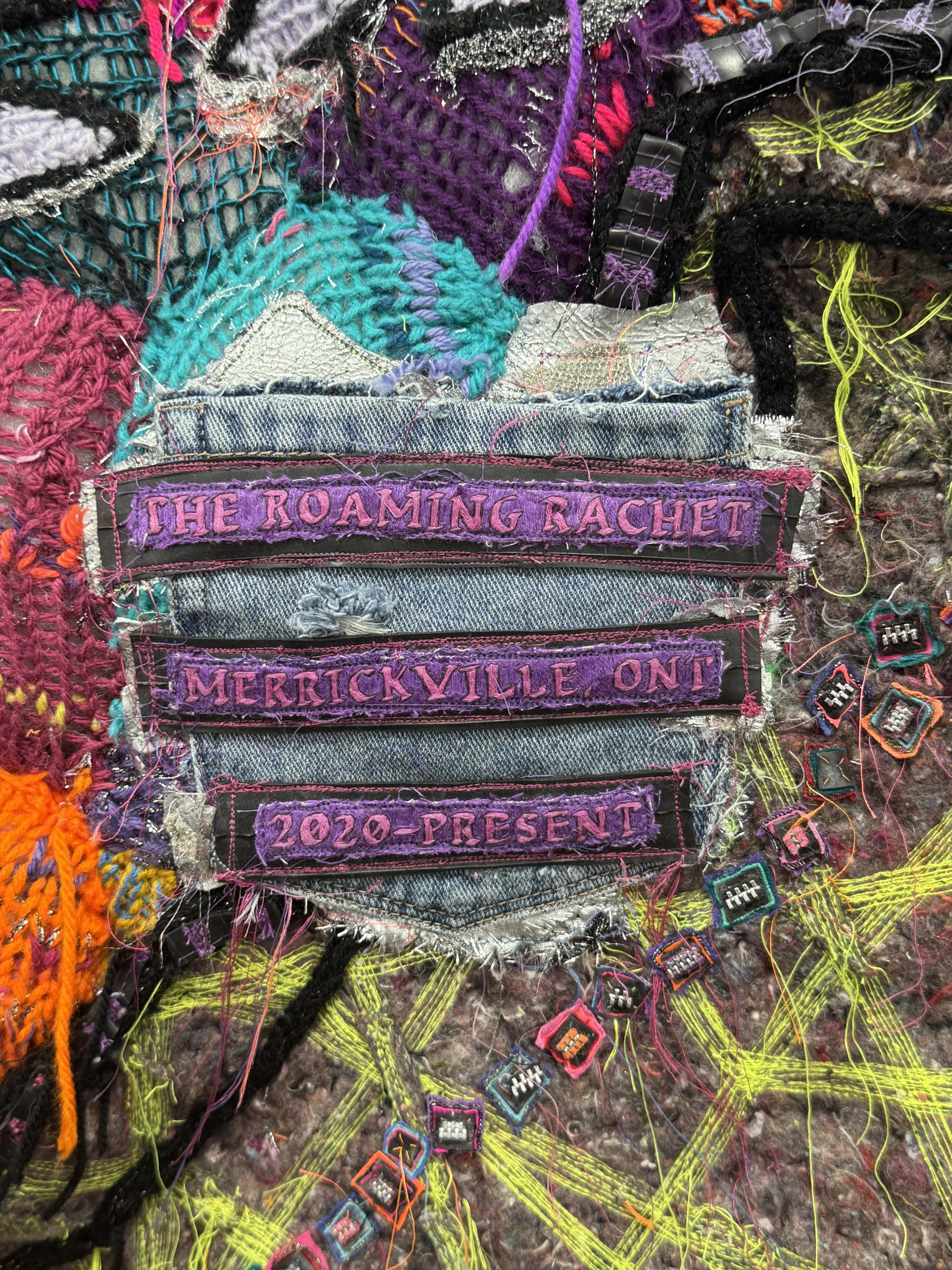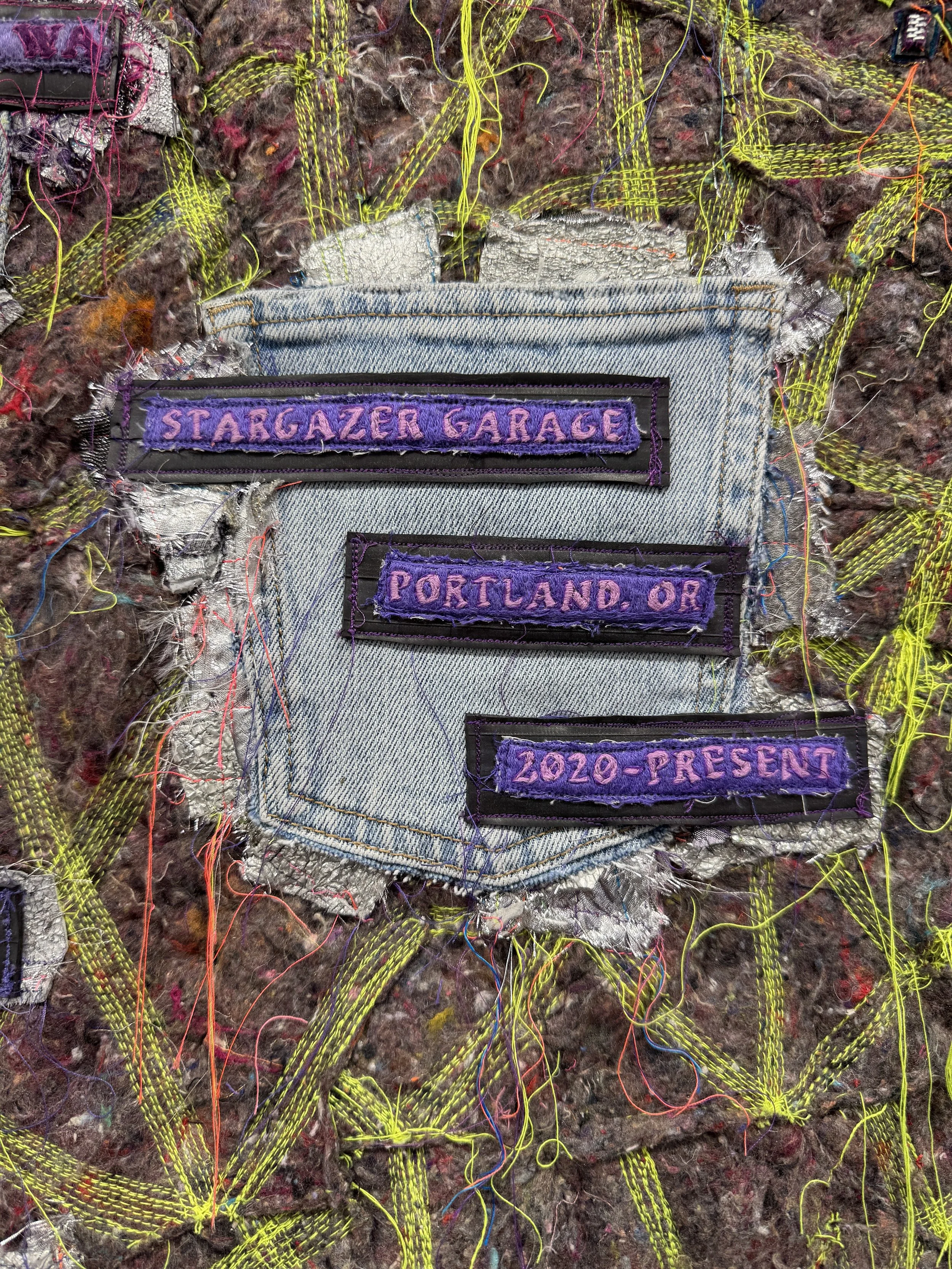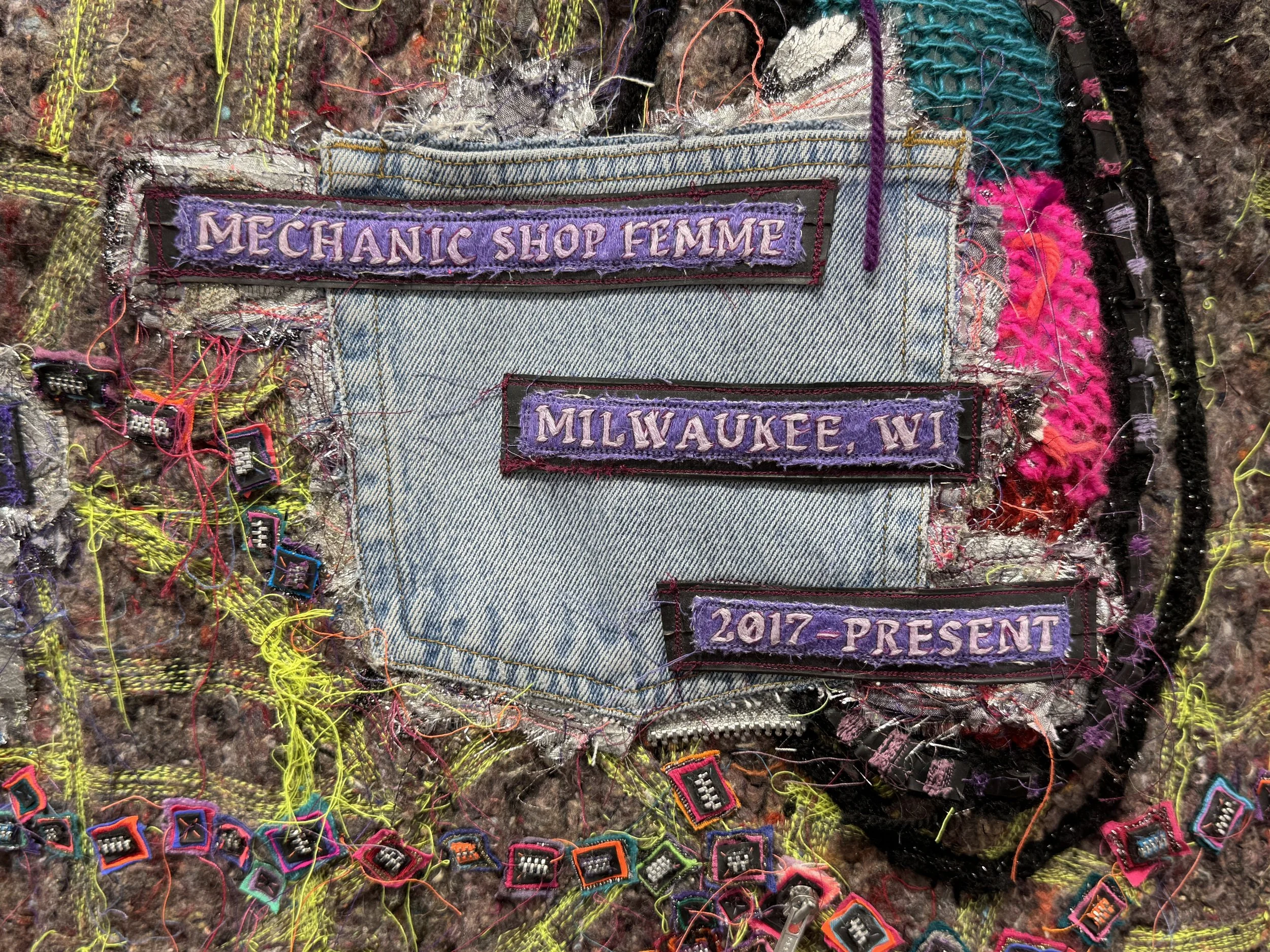 The centerpiece of The Queer Mechanix project is a large-scale quilted map of queer and trans auto mechanic shops across the United States and Canada that operated from 1969 to 2023. Roberts utilizes an expansive range of textile techniques, including toy knitting machines and hand-stitched embroidery, to create a monumental textile collage. The map ration of each of the shops in single-strand embroideries, sewn onto upcycled rubber tire innertubes and blue jean pockets. Zippers mounted on rubber and hand-sewn fabric demarcate the interstate road system that crisscrosses the United States. Assembláged road markers illustrate the roadway connections of these auto mechanic shops and evoke the presence of drivers who traverse the highways.